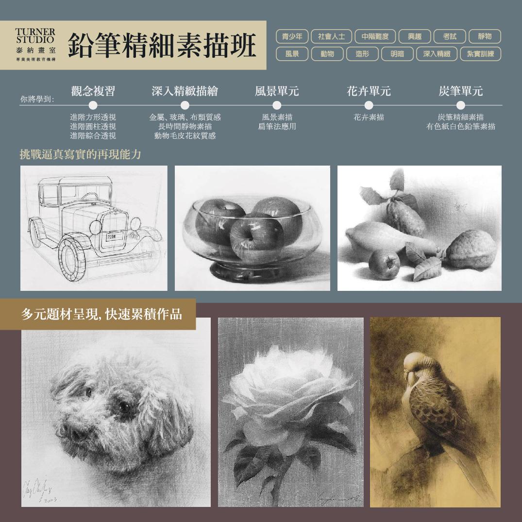 在具備「平面座標抓形法」、「透視結構」與「作畫程序」等基礎素描能力後,鉛筆精細素描班會以「深入寫實」為主要學習目標。本課程前段會複習「造形與明暗」觀念,造形的部分會藉由題材難度的進階來提升精準度,而明暗的部分則會在立體的基礎上加入精細質感表現,深入營造逼真寫實的畫面再現。精細素描班旨在訓練學員養成細膩的筆觸與線條,為後續的炭精筆素描打下良好的筆觸基礎。