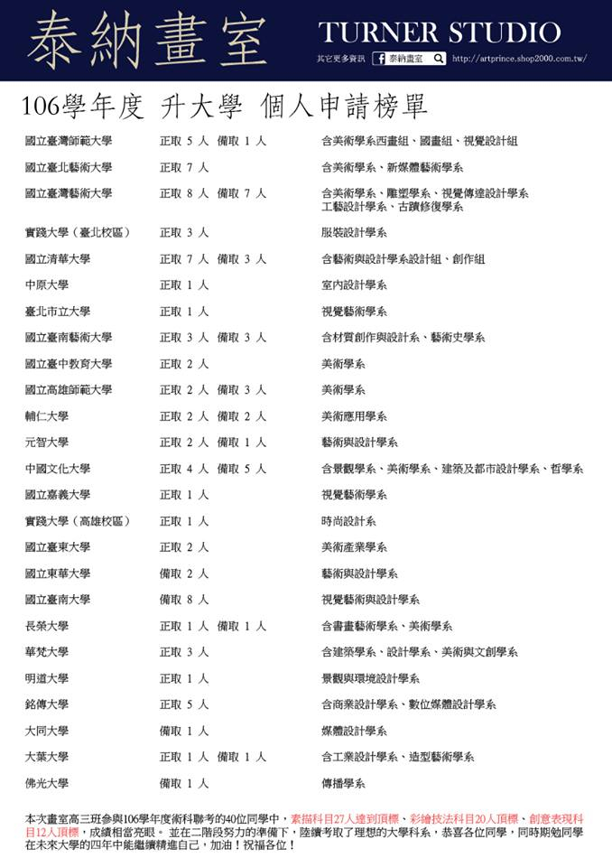 106學年度個人申請的結果陸續出來了!首先恭喜各位畫室同學!